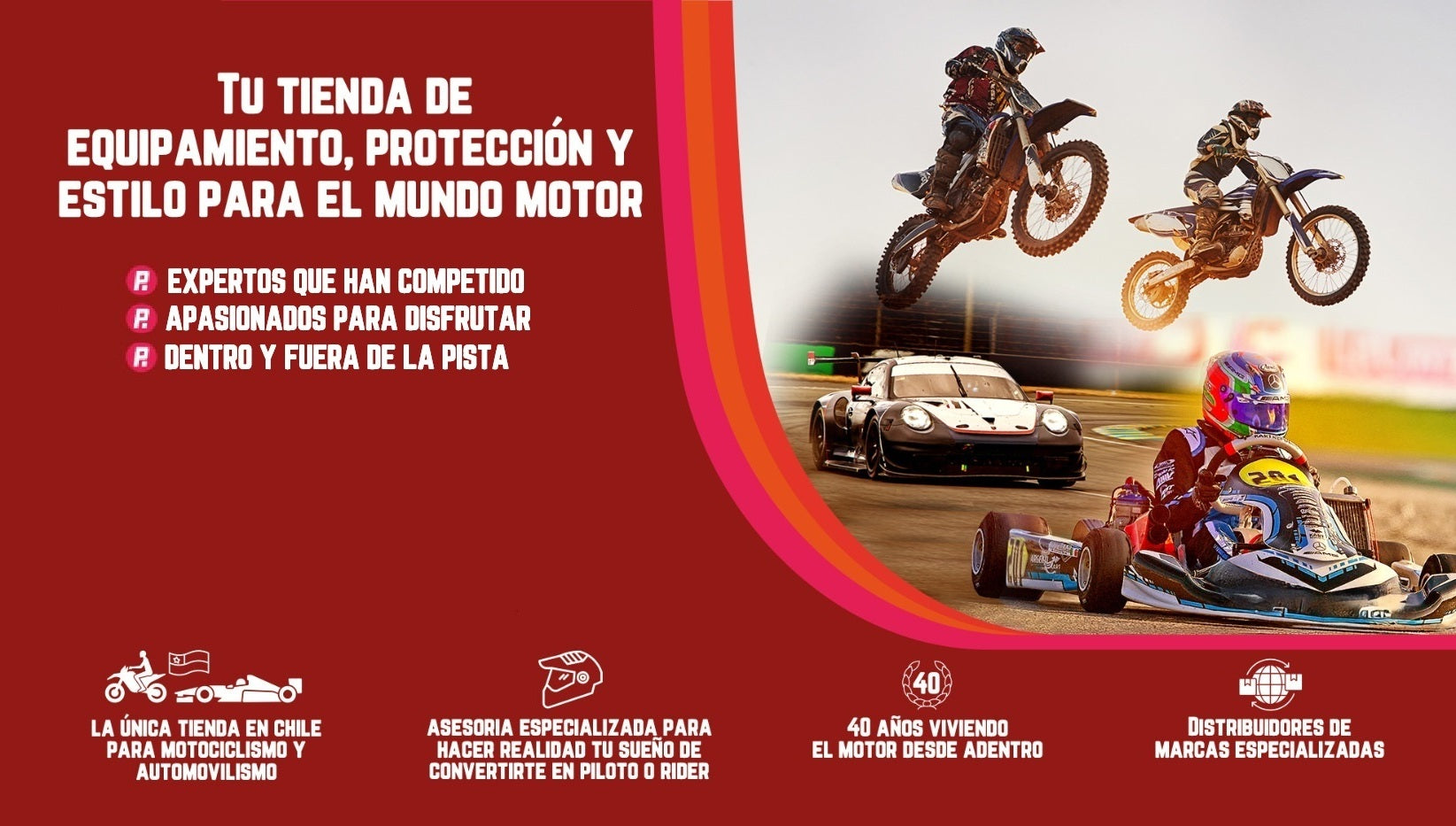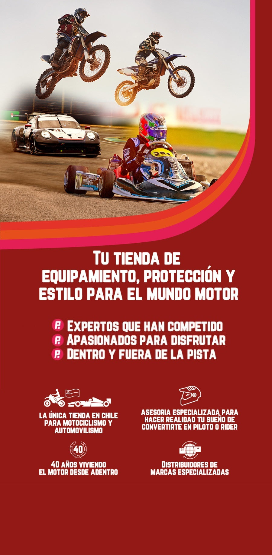 Con más de 40 años de experiencia, hoy contamos con tienda especializada, ecommerce para todo el país, una red de distribuidores y presencia en las principales carreras con nuestro stand.